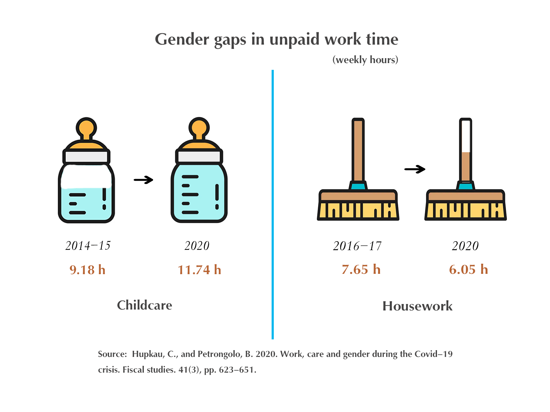 In the aspect of childcare, the finding is that from 2014-15 to 2020, In families with children, mothers' weekly childcare hours raised from 16.99 to 26.5, and fathers' hours raised from 7.81 to 14.76. However, mothers' childcare time increases more than fathers, with a corresponding increase in gender differential from 9.18 hours to 11.74 hours. (Hupkau and Petrongolo, 2020)